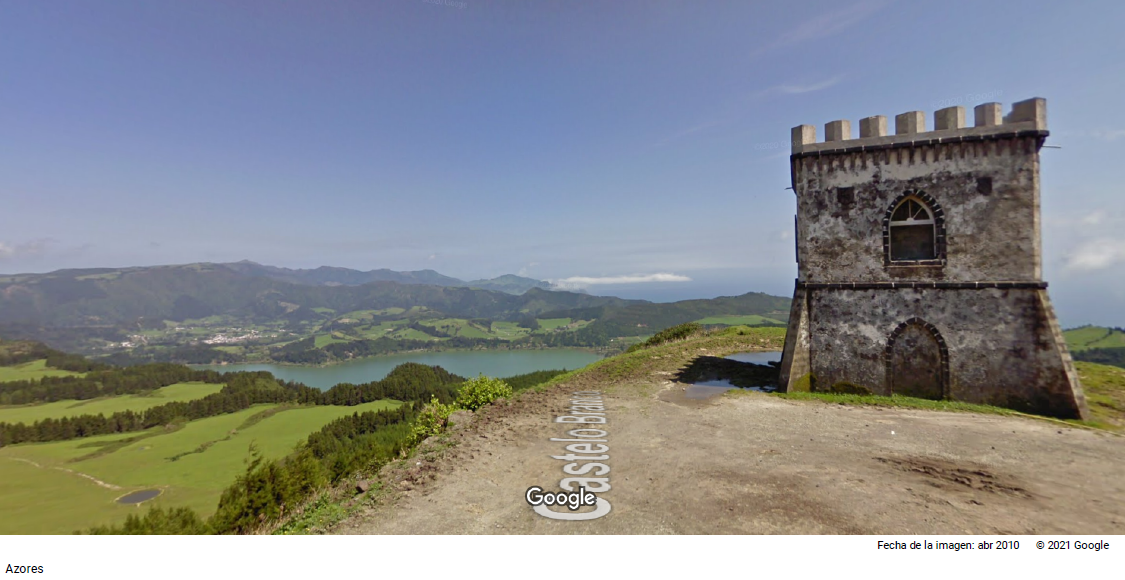 Avanzando un poco por las carreteras streetviewficadas (perdón por el palabro; juro que no morirá ningún gatito por esto) constaté que las Azores son unas islas muy verdes, con más vegetación de la esperada y un rico ecosistema, además de muchas vacas. Es como Galicia en formato isla. Y como en casi todas las islas que conozco, existen varios miradores también en São Miguel que muestran el vasto océano y un horizonte a veces marcado por los relieves de otros islotes cercanos.Esta isla azoriana cuenta también con varios lagos, que dejan bonitas estampas para los visitantes, como las que capté en pantalla en Cerrado das Freiras, al lado de la Lagoa Azul. Otra imagen que me gustó para ilustrar este viaje virtual fue la que ofrece el Miradouro de Castelo Branco, una vista de Lagoa das Furnas y el pueblo de Vila Franca do Campo. Este edificio es una pequeña torre fortificada del S.XII aproximadamente, que servía a los señores de la época para controlar sus tierras. Según los datos que he encontrado, suele estar abierta y se puede subir hasta la cima para obtener mejores vistas aún si cabe.